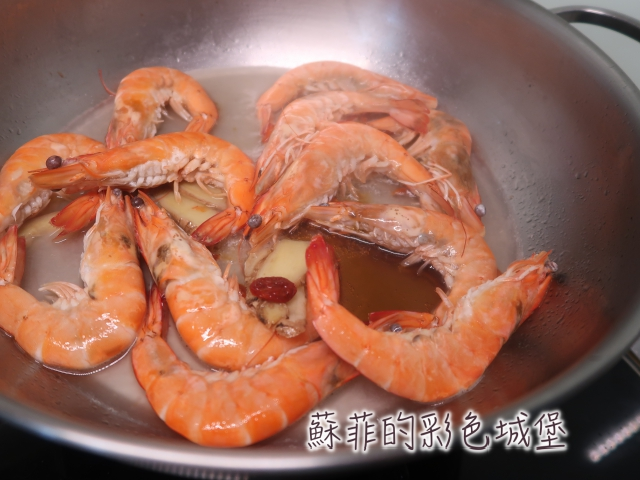 步驟4: 翻炒到白蝦已經約8分熟時,加入麻油、米酒、枸杞和適量的鹽巴,翻炒至白蝦全熟,即可呈盤享用囉。
