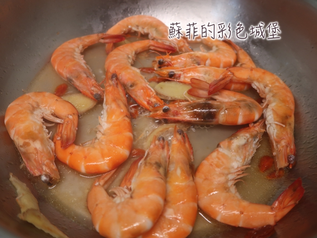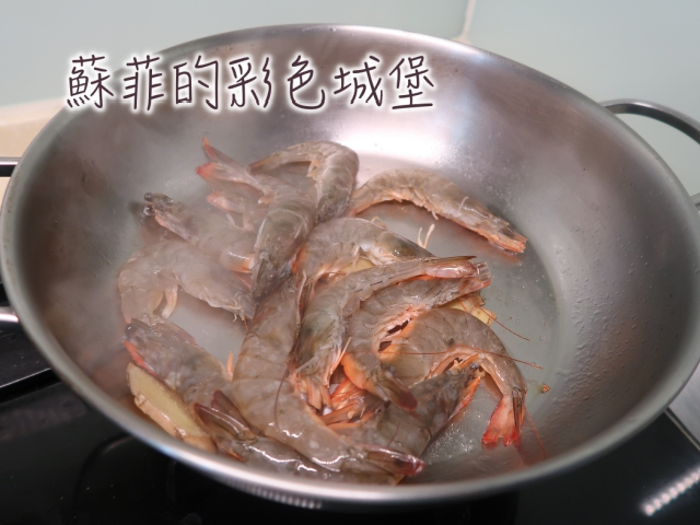 步驟3: 爆出薑片的香氣後,就可以將處理好的白蝦放入鍋中翻炒。