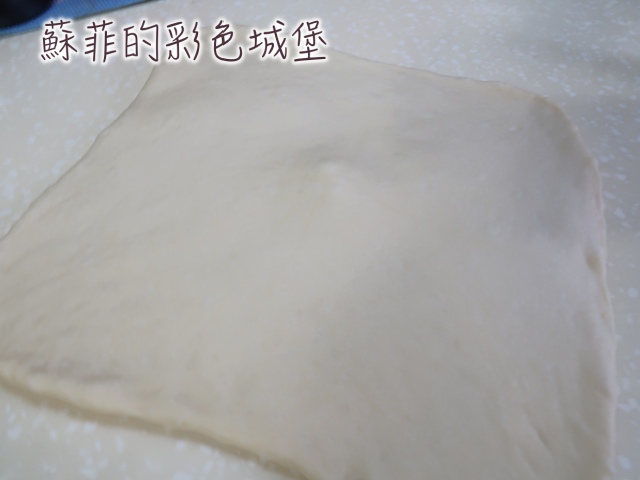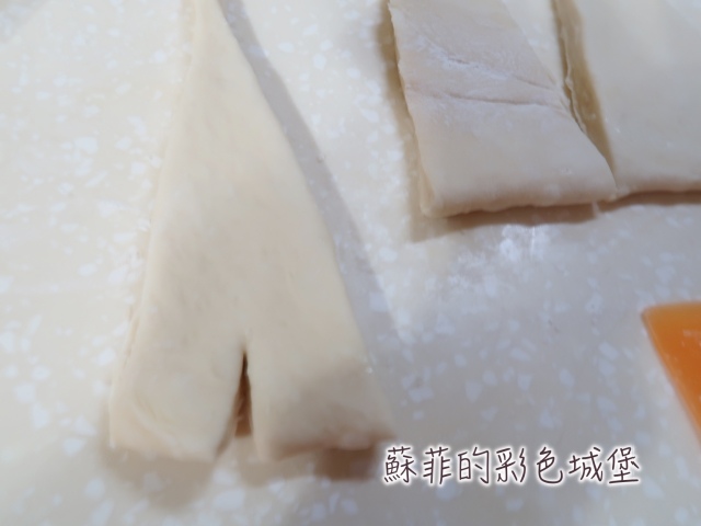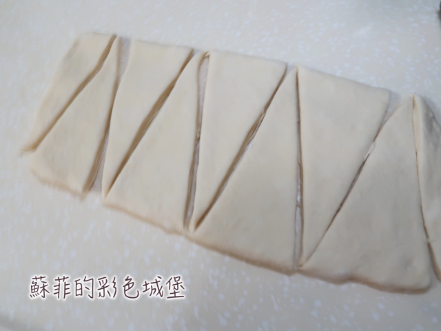 步驟12: 用刀子將麵皮切成長20公分,寬度約8~10公分的三角形。(我切得有點隨意...)