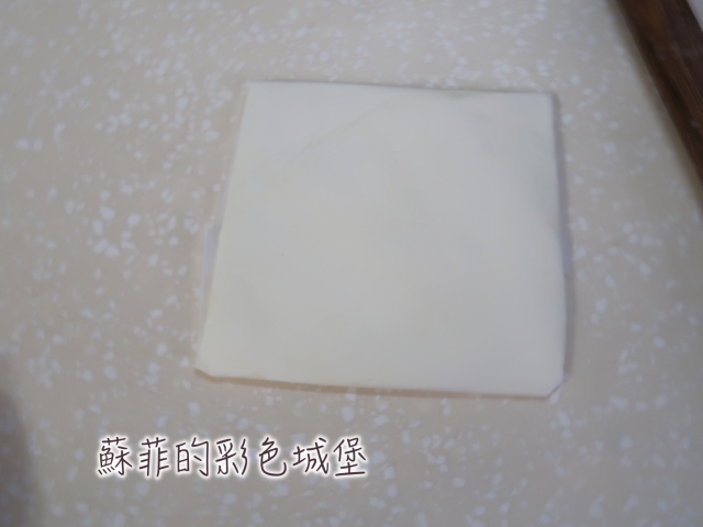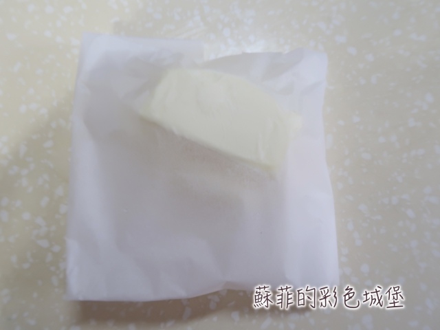 步驟3:利用麵糰發酵時間來製作中間夾層奶油。用烘焙紙包住奶油,折出長寬各15公分的正方體,再用桿麵棍敲軟奶油,桿出約長寬各15公分的正方體,桿好後放冰箱冷藏。