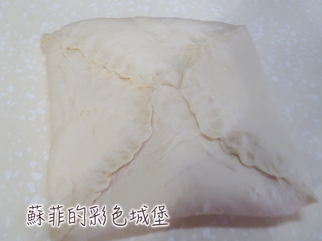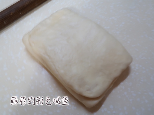 步驟9: 用刷子清掉多餘的麵粉,折三摺後,密封好再放入冰箱鬆弛約15分鐘。