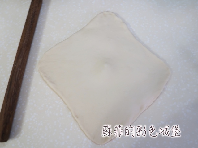 步驟5: 用桿麵棍輕輕推開成十字狀。(若不好推時,表示麵粉不夠,需再撒上一些。)
