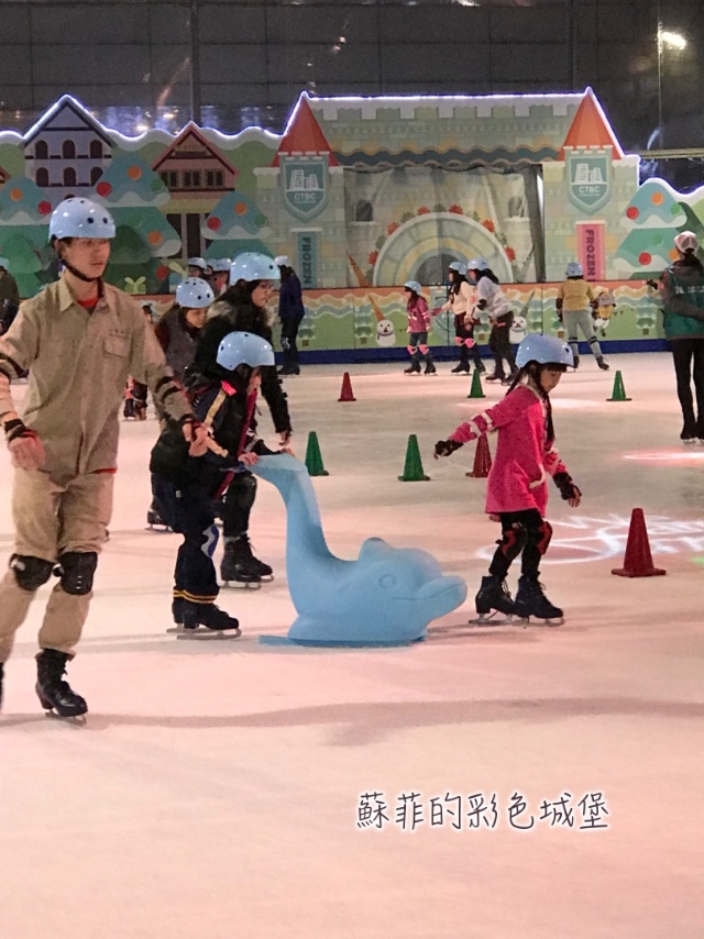 今年最不一樣的是,多了這台溜冰輔助器,有企鵝和海豚的造型,可以幫助不會溜冰的小朋友克服滑倒的恐懼感喔!但場上數量有限,小朋友要輪流使用!