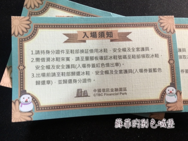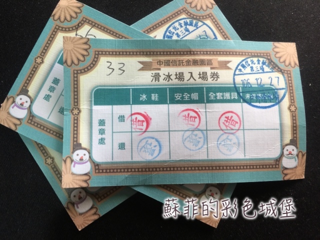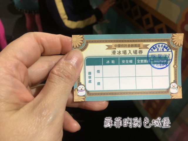 入場後,就先去量一下腳的長度,準備排隊來領所有的配備囉!這張票券要保管好喔,出場的時候,服務人員會確認所有的器材是否都歸還了,才會讓你出場喔!