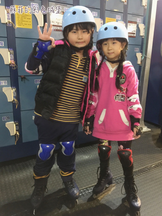 終於穿戴好所有配件的兩位小公主!因為溜冰鞋很硬,最好要穿厚長襪,才不會刮傷腳喔!