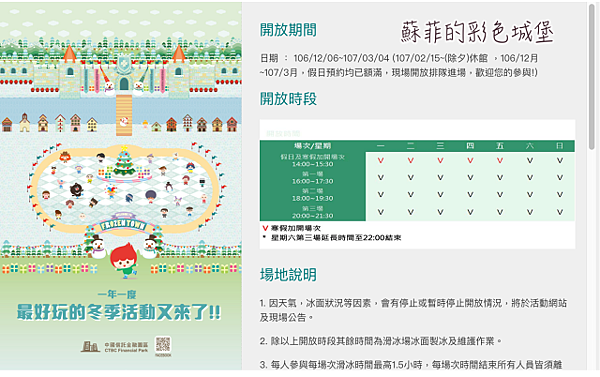 今年開放的時間是106/12/06到107/03/04! 107/02/05(除夕)休館,目前假日的預約都已經額滿了,但現場還是可以開放排隊進場,不過最好避免假日去玩,除非你已經有心理準備要排約1~2個小時喔!上星期六,蘇菲的同學就排了1個半小時才入場的呢!