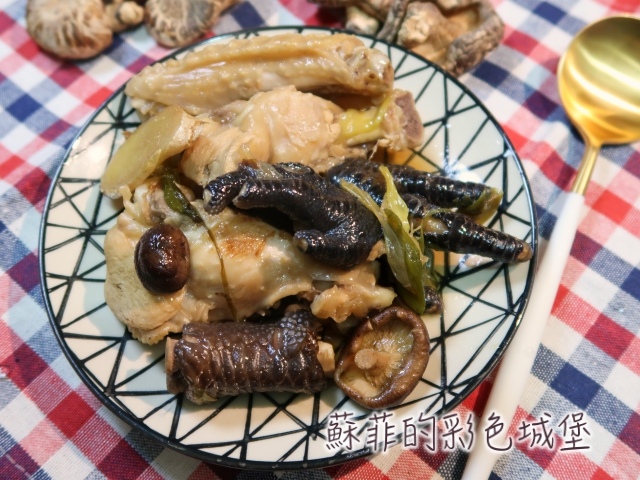 步驟6: 依序加入泡水後的香菇(連同泡香菇的水)、和所有調味料,再加入些許水,淹過1/2的雞肉。