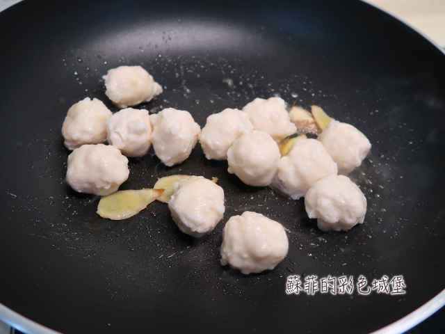 步驟2: 薑片煸香後,即可加入退冰、洗淨擦乾的花枝丸入鍋一起翻炒。