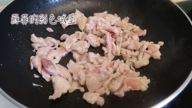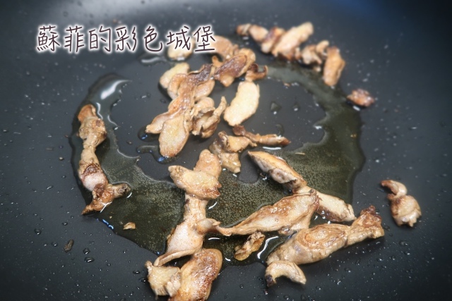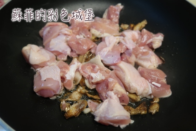 步驟4: 老薑煸好後,加入醃好的去骨雞腿肉於鍋中,小火煎到雞肉兩面呈現金黃色。