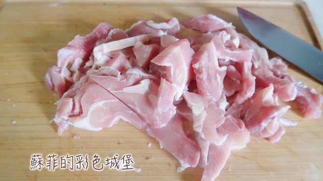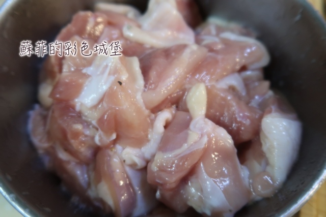 步驟3: 趁煸香老薑的同時,將去骨雞腿肉切成小段,加入醃雞肉醬料,抓醃約15分鐘。