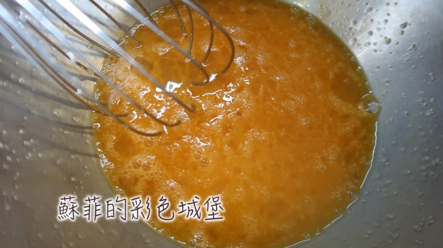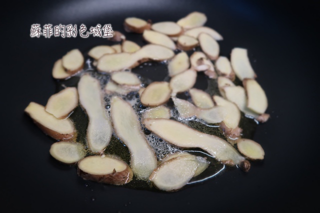 步驟2: 起一油鍋,加入苦茶油,小火煸香老薑片,約需20~30分鐘,要煸到老薑呈現金黃色,略為乾扁。